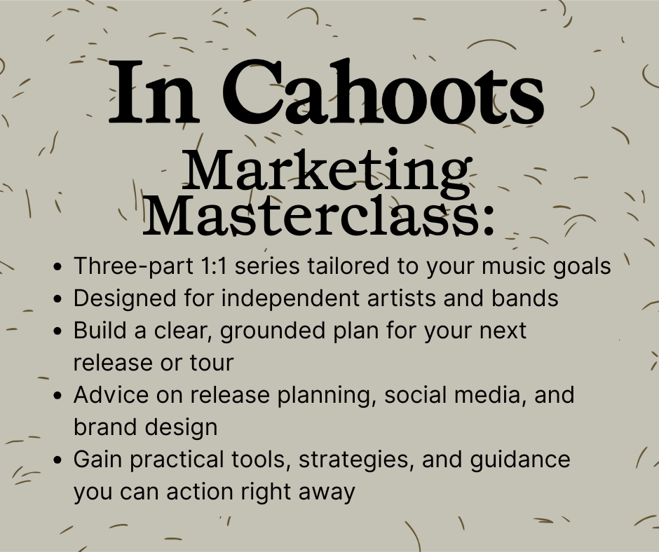 Receive a three-part 1:1 masterclass series designed for independent artists or bands. In Cahoots will help you shape a clear, grounded plan for your next release or tour. Strategy, structure, and a bit of backup when you need it!